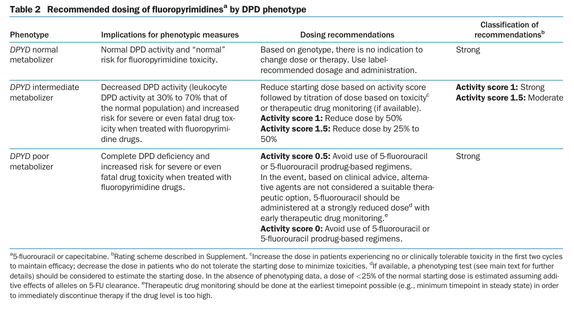View dosing instructions for DPD deficient patients published by the Clinical Pharmacogenetics Implementation Consortium (CPIC).